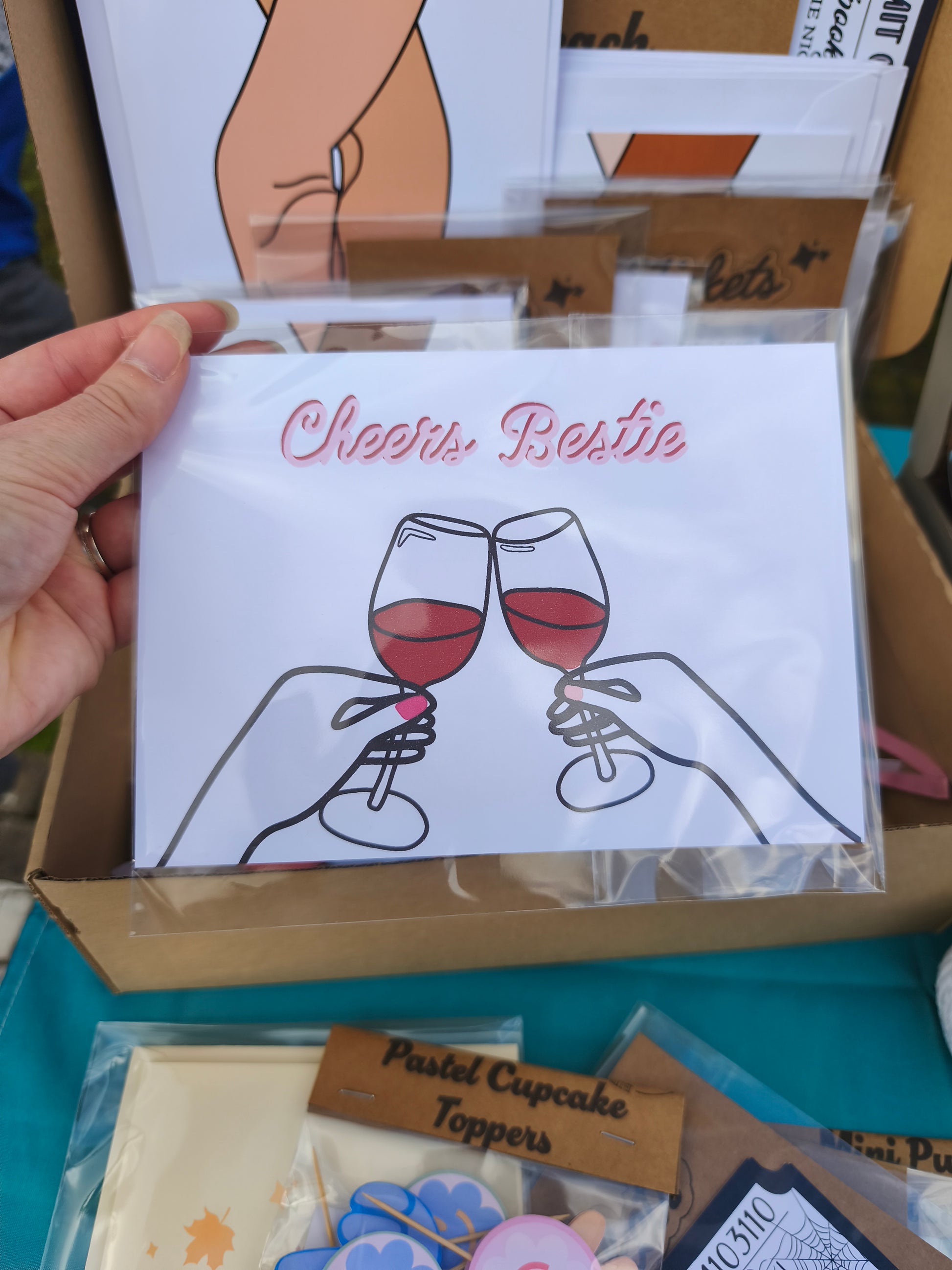 We're Girls, of course we want to binge watch true crime postcards and Cheers Bestie Postcards.